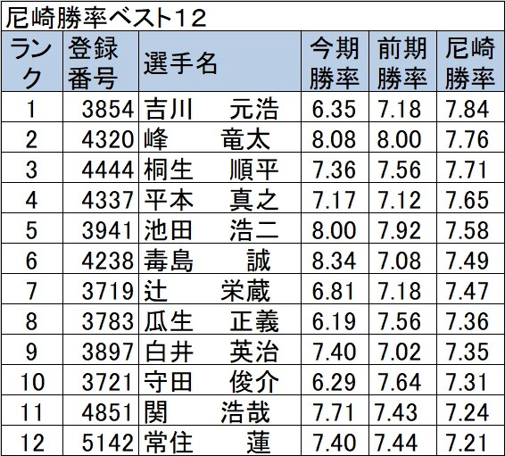 尼崎競艇場での当地勝率上位12名を並べると、1位は吉川元浩選手。とはいえ、2位以下も大きな差はありません。