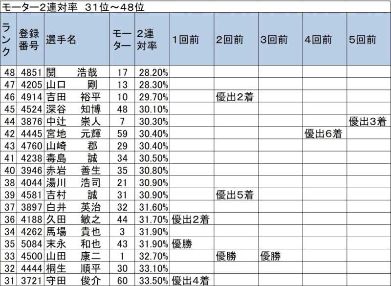 一方で、ワーストモーターも見てみましょう。今回は少し幅を広げて、31位~48位までをワースト組として見てみます。