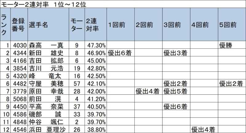 この4名の選手は、数字には表れない「ポテンシャルの高いモーター」を引いたと見てよいでしょう。