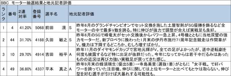 その中でも、4号機と44号機は相当な高評価のようです。特に44号機は峰竜太選手が仕上げたモーターとのことで、これはかなり期待できそうです。